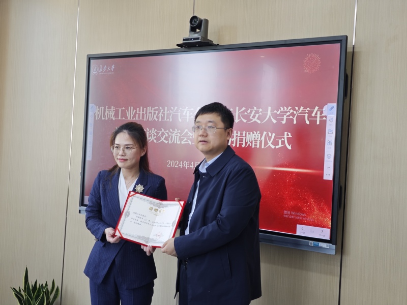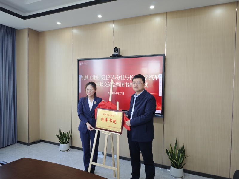 机械工业出版社汽车分社为304am永利集团捐赠图书300余册,陈轶嵩代表学院为汽车分社颁发捐赠证书,并与赵海青一同为汽车书苑揭牌。